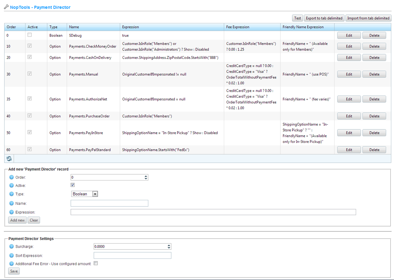 Do you need to conditionally determine which payment methods to present to your customers? The Payment Director allows a store owner to calculate which payment methods and fees for complex scenarios by allowing conditional expressions to determine what payment methods apply, and expressions to calculate Fee and Name.